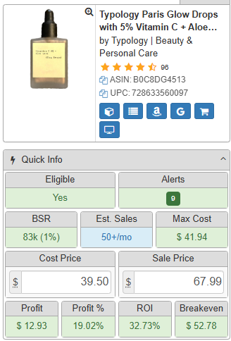 Plug those numbers into SellerAmp (a tool I will write more about in another post) and you get the following output: