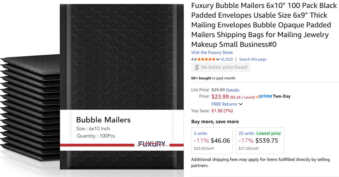 If you decide to fill orders yourself via FBM, you’ll want bubble mailers for packing items.