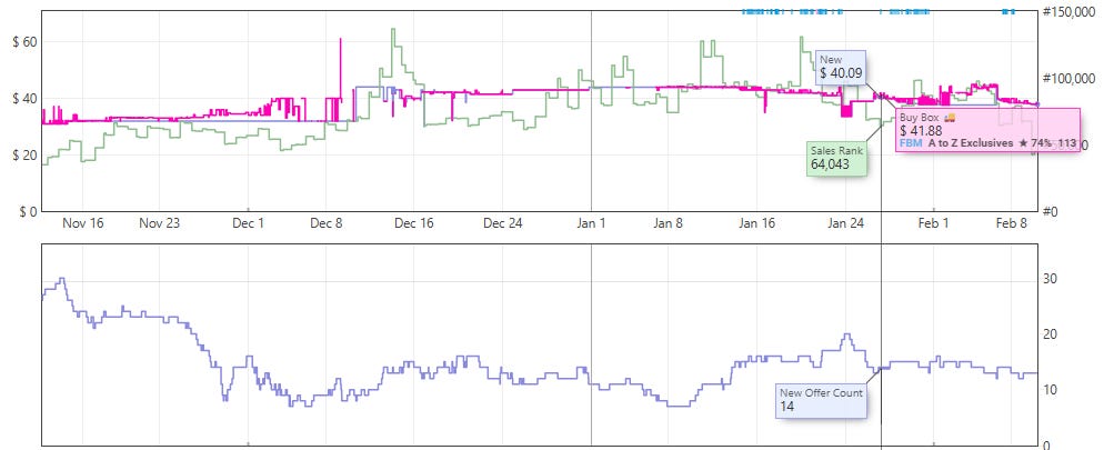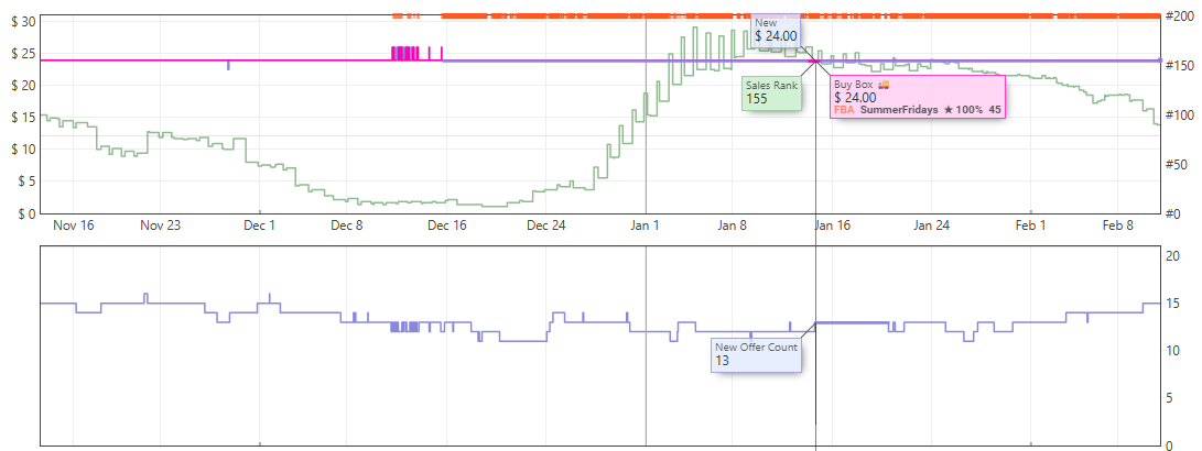 Your typical Keepa chart with all the attributes we care about looks something like this: